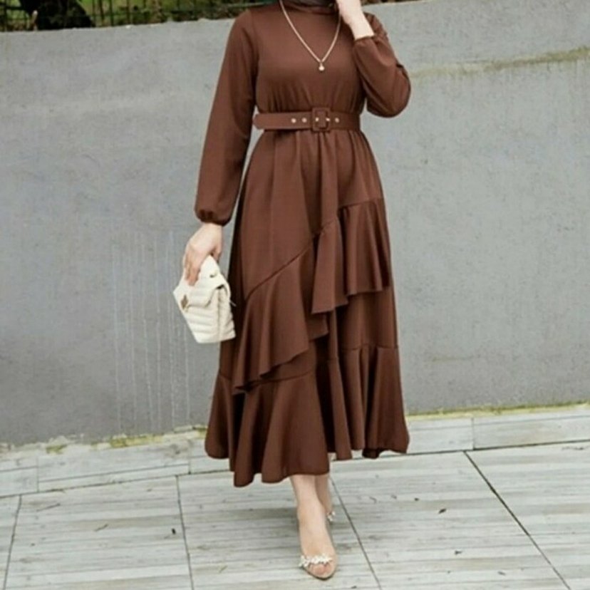 Kahverengi Kuşaklı Uzun Kadın Elbise