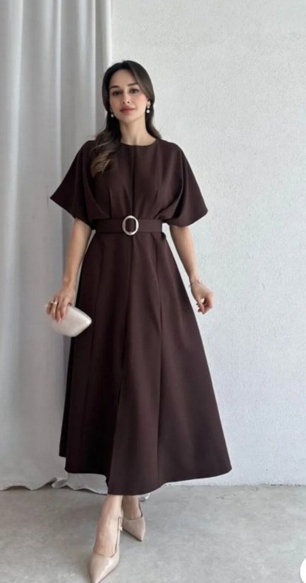 Kahverengi uzun elbise, tek parça kuşaklı ve kısa kolludur. Bol kesim ve ipeksi dokusuyla modern klasik tarzı yansıtır.