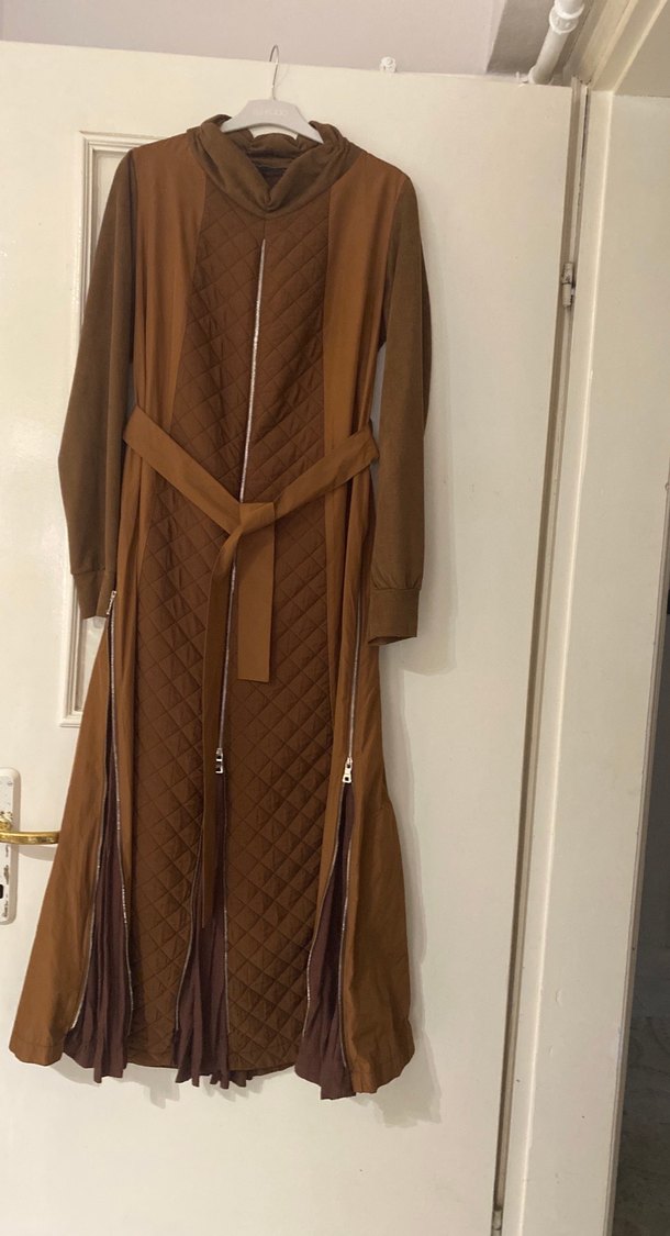 Kahverengi uzun kadın kaban, yüksek yakalı ve askılı kolludur. Kuşaklı bel ve kapitone detaylı, sentetik kumaştan üretilmiştir. Sokak stili ve günlük kullanım için uygundur. Boyu 130 Göğüs 50 36 -38 beden uyumlu .Misswhence ürünleri geniş kalıptır. Bele kadar ayarlanabilir iki yanlarda femuar vardır.1 defa öğretmenler günü yemeğinde giyildi. Markayı bilenler bilir tasarım üründür.Misswhence hem kaliteli hem tarz markadır.