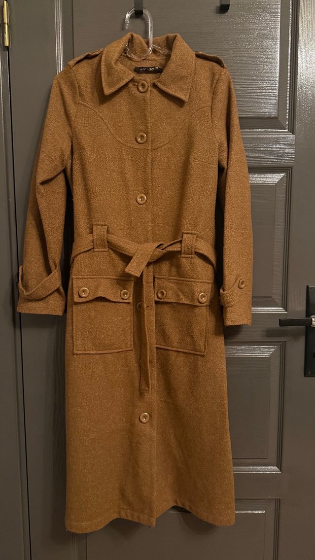 Kahverengi uzun yün kaban, kuşaklı bel ve kesik yaka ile tasarlanmıştır. Rahat kesim ve uzun kolludur, vintage sokak stiliyle ofis kullanımı için uygundur.