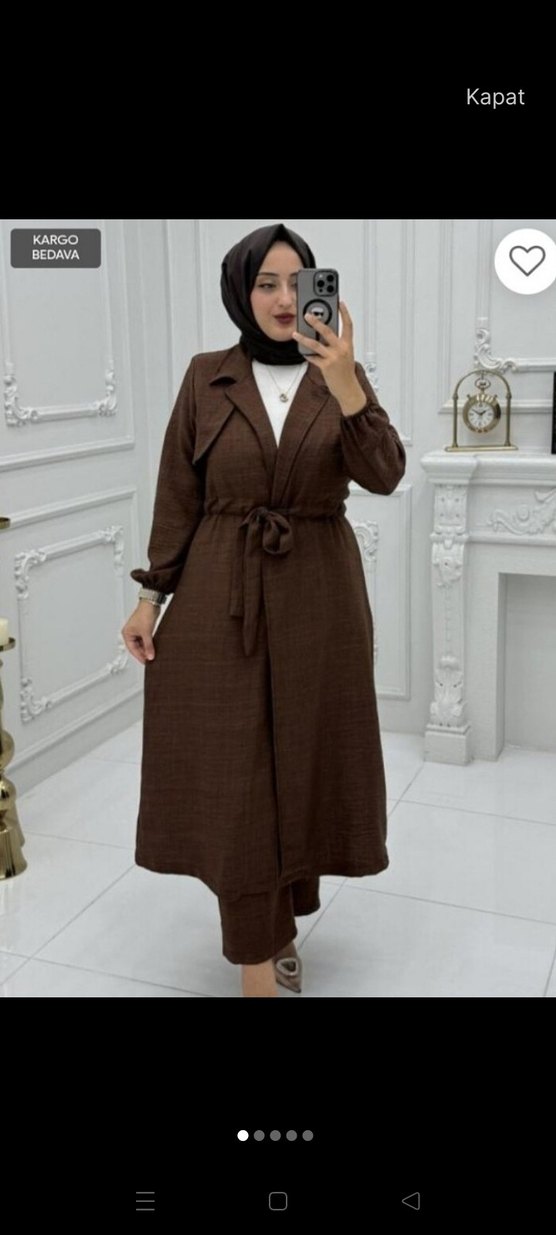 Kahverengi uzun keten , kuşaklı ve kesimli yakalıdır. Uzun kollu ve rahat kesim, günlük ve iş stiline uygundur. ikili takım pantolon beli lastikli 46 48 bedene
