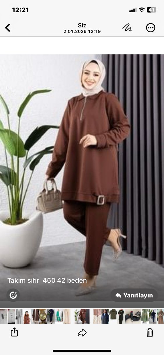 Kahverengi, yüksek yakalı, uzun kollu ve kuşaklı bel detaylı bol kesim kadın takımı. Pürüzsüz sentetik kumaştan, rahat sokak stiline uygun.