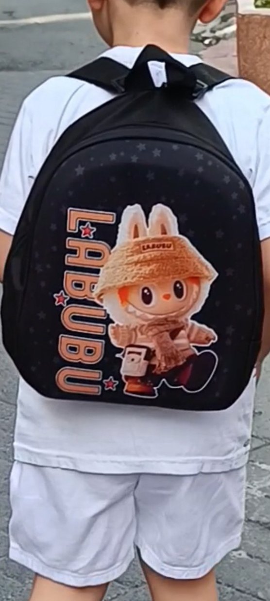 Koyu kahverengi çocuk sırt çantasında yumuşak peluş Labubu karakteri ve ön cepte marka yazısı bulunur.
