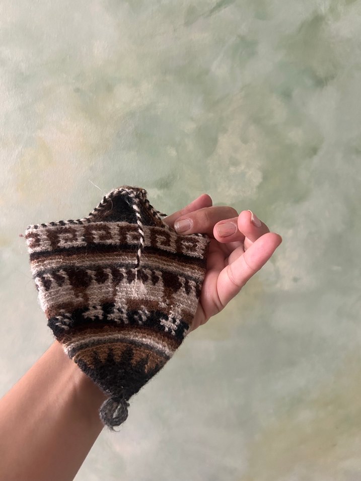 Kahverengi bağlama desenli, dokuma kumaştan cüzdan perudan alındı