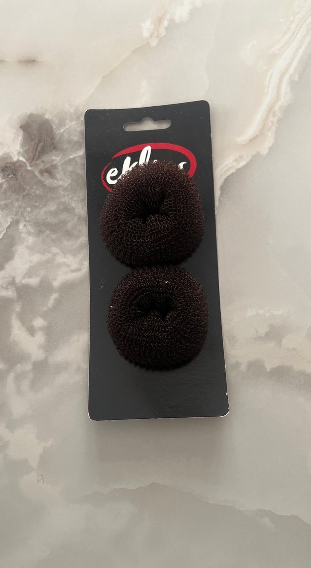 Kahverengi, lastikli ve kauçuk malzemeden yapılmış iki adet saç tokası, saçı sağlam tutar.