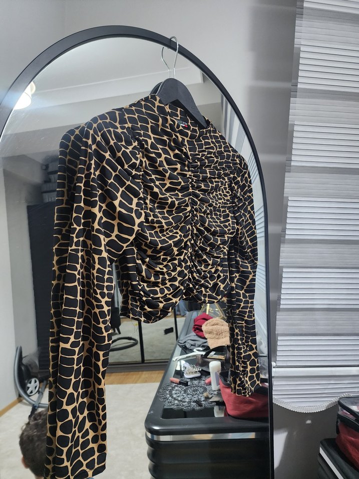 Dar kesim, uzun kollu ve boğazlı bu kadın bluzu, yumuşak sentetik kumaştan yapılmış kahverengi baskılı desene ve drapeli detaylara sahiptir. çok az kullanıldı hoş bir duruşu var bana beden olarak küçük geldiği için satıyorum standart beden esneyen bir kumaşa sahip