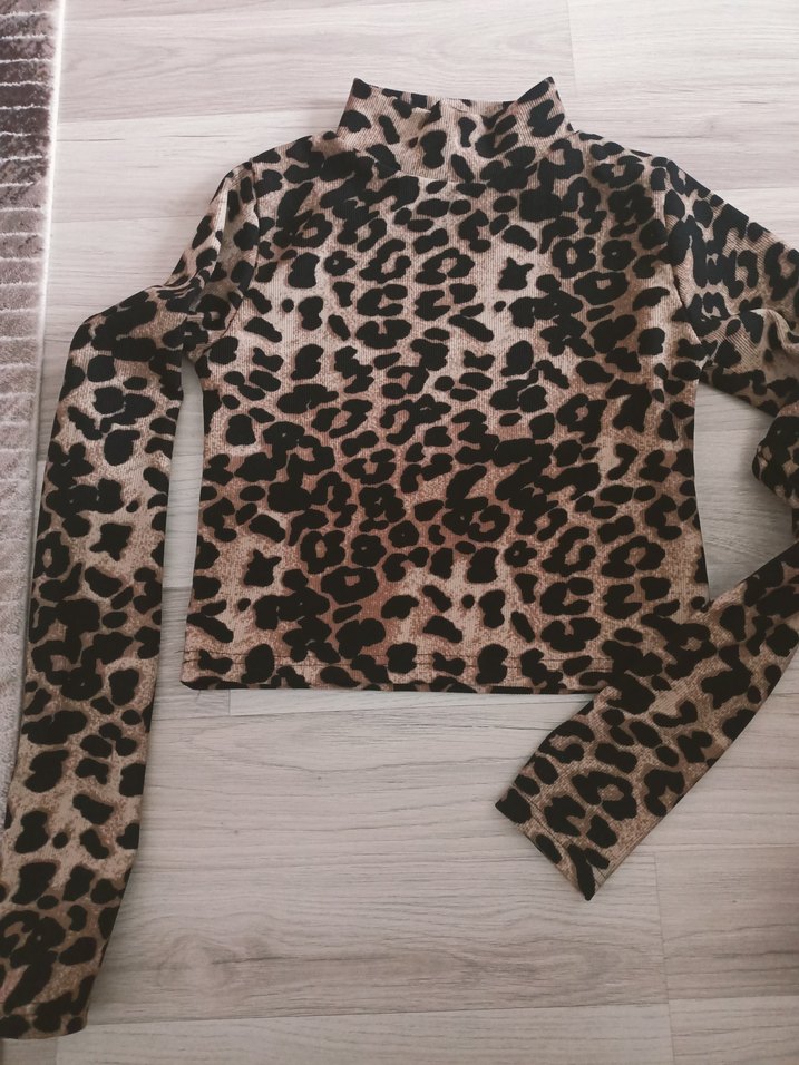 Kahverengi leopar desenli, balıkçı yaka ve kürk detaylı, dar kesim uzun kollu bluz, rahat sokak stiline uygundur. yeni hiç kullanılmamıştır