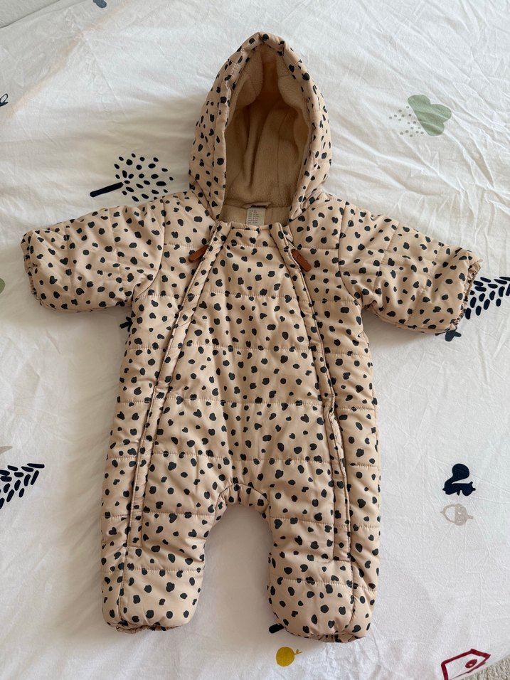 Kahverengi leopar desenli, kapüşonlu, soğuk havalar için sıcak tutar. 4. aya kadar rahat kullandık. Sadece bir ayağının kıvrıldığı yerde küçücük kumaş atmış. Onun haricinde yeni gibi.