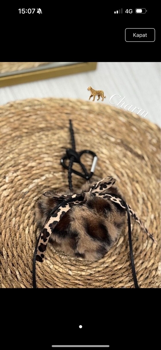Kahverengi, leopar desenli yumuşak dokulu kurdele ve ip detaylıdır.