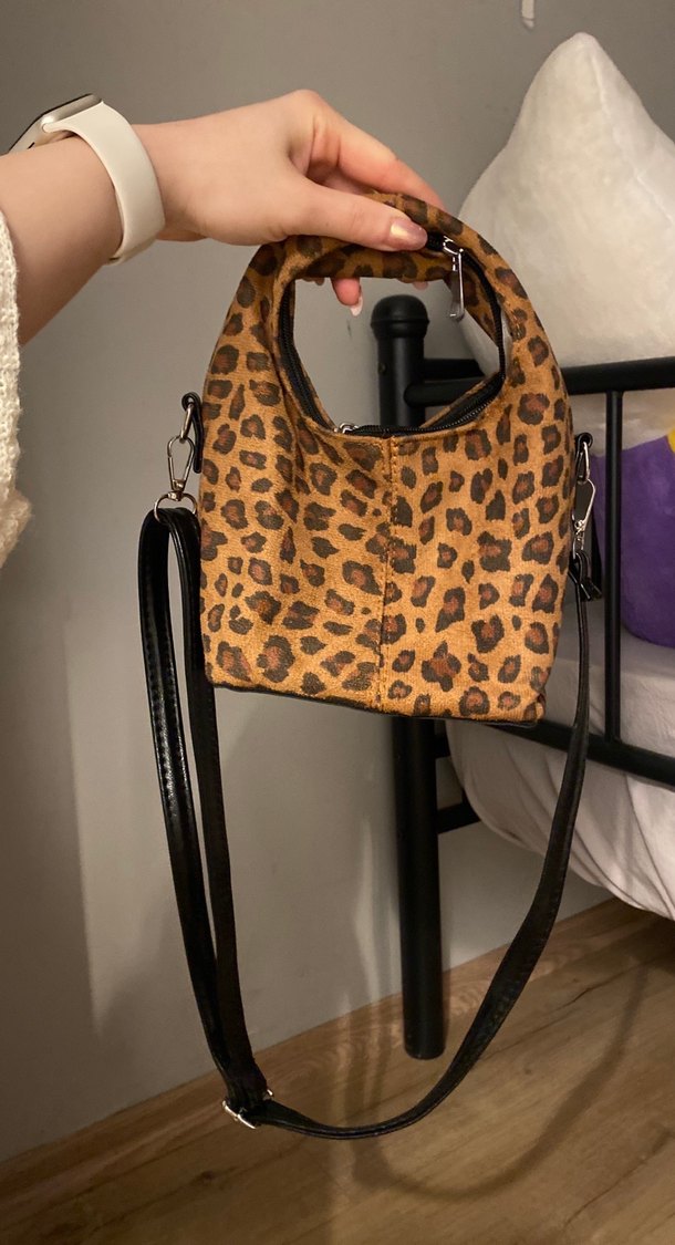 Kahverengi deri çanta, leopar desenli ve tokalıdır. Kulpu ve çıkarılabilir askısı vardır, günlük sokak stili için uygundur.