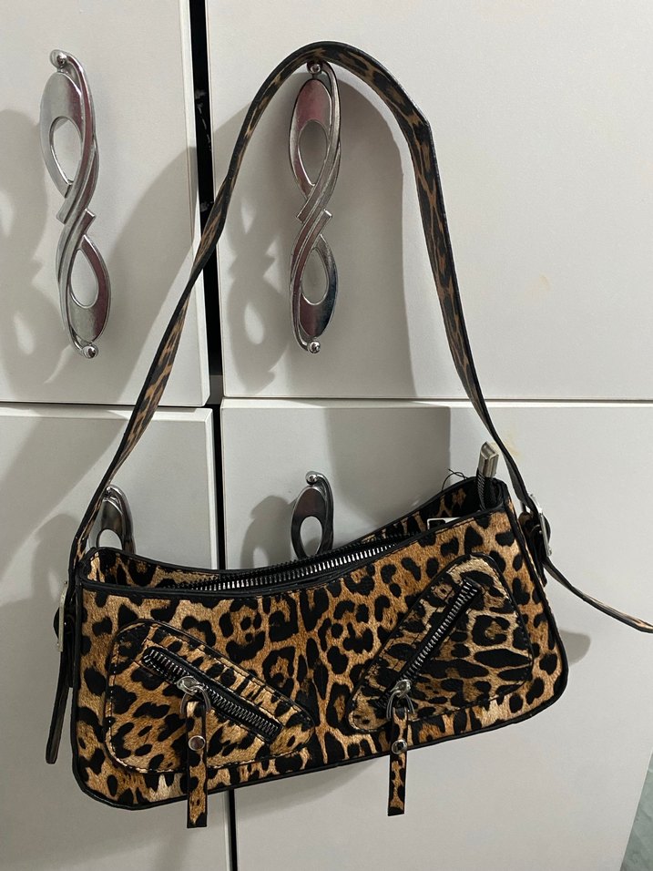 Kahverengi leopar desenli deri çanta, tokalı detaylarıyla cesur bir sokak stili sunar.