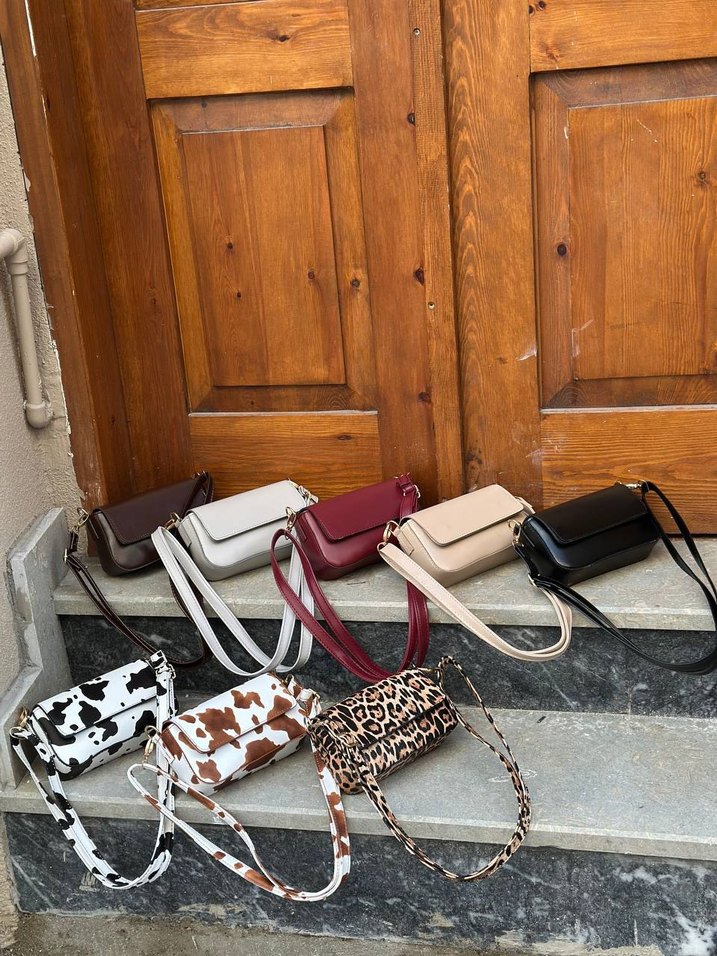Deri kadın çanta, tokalı kayış ve leopar desenli, günlük kullanım için çağdaş tasarım.
