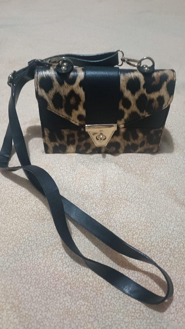 Kahverengi deri, leopar desenli, tokalı kadın çantasıdır. Sokak stiline uygun, günlük kullanıma rahat bir modeldir.
