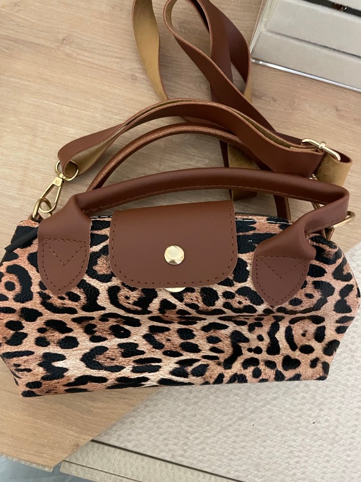 Kahverengi deri, leopar desenli ve tokalı kadın çanta. Bohem tarz için uygun, saplı ve ayarlanabilir omuz askılı. Hiç kullanılmadı