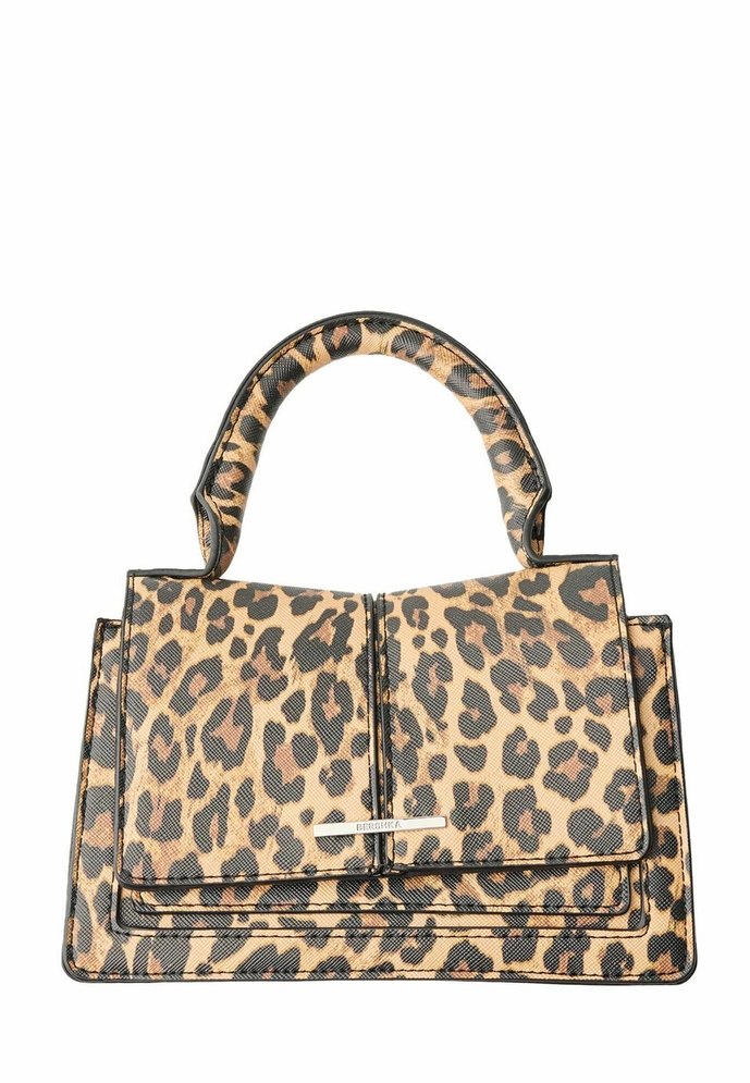 Kahverengi deri kadın çanta, koyu leopar desenli ve tokalı detaylı, trend günlük tarz için uygun.