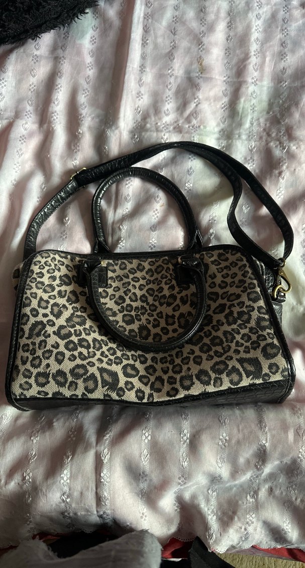 Kahverengi leopar desenli deri kadın çanta, tokalı detaylarla goth tarzını Paris şıklığıyla buluşturuyor.