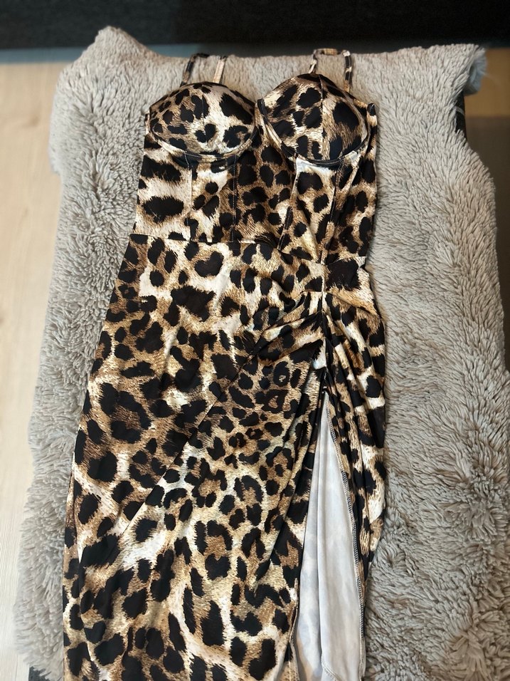 Kahverengi leopar desenli, kürk detaylı, straplez uzun elbise. Sentetik kumaştan, fit kesim ve sokak stilini yansıtan tasarım.