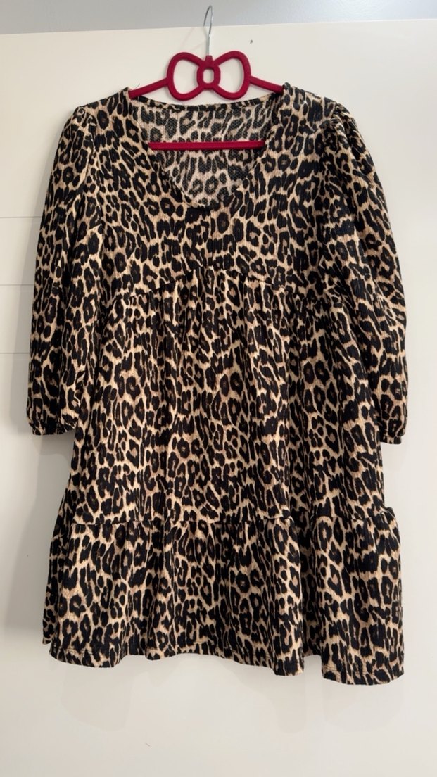 Koyu kahverengi leopar desenli, V yakalı, uzun kollu, bol kesim elbise.