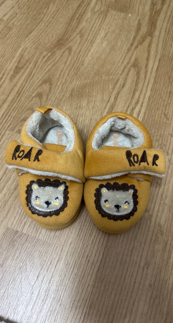 Kahverengi leopar desenli, içi yumuşak kürklü ve fleece kumaşlı erkek çocuk sıcak terlik. Kayışlarında 'ROAR' nakışlıdır.