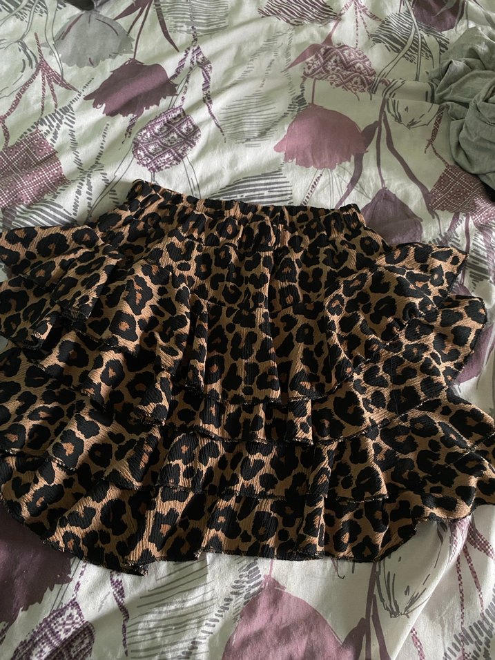 Kahverengi leopar desenli, şortlu,fırfırlı ve bol kesim midi etek, yumuşak sentetik kumaştan, rahat ve bohem bir sokak stili sunar.
