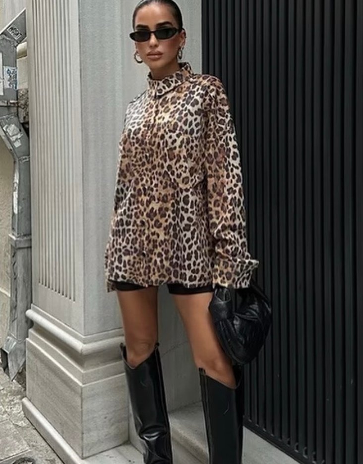 Kahverengi deri, leopar desenli, yüksek yakalı ve uzun kollu kadın bluz. Salaş kesim ve kısa boyuyla sokak modasına uygun, detaylar içerir. Beden belirtiniz S M L XL