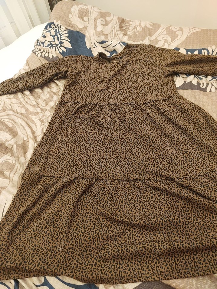 Uzun, bol kesim kahverengi leopar desenli hamile elbisesi. Uzun kollu ve V yakalı, yumuşak sentetik kumaştan, rahat sokak stili için uygun.