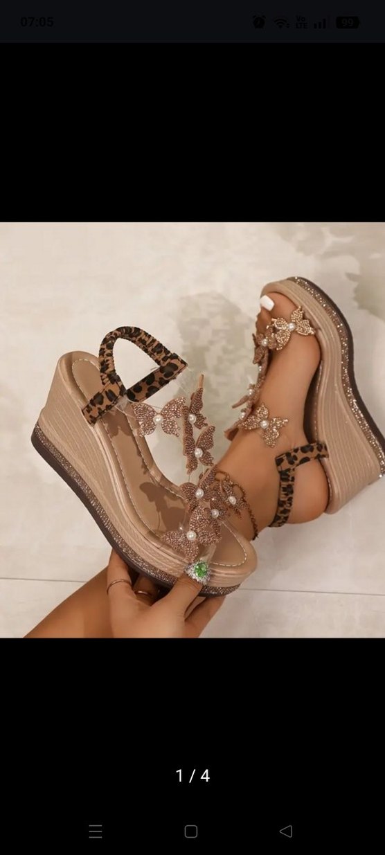 Kahverengi dolgu topuklu sandalet, leopar desenli bantlar ve boncuklu kelebek süslemelere sahip. Rahat kauçuk dolgu tabanlı, günlük kullanım için uygundur. Sıfır ürün hiç kullanılmamış.