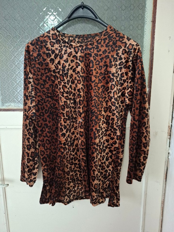 Uzun kollu, kahverengi leopar desenli, dar kesim ve yuvarlak yakalı bluz. Yumuşak kürk detaylı, sentetik kumaştan, bohem ve retro tarzda rahat bir günlük kıyafet. Çok kullanılmamıştır.Üzerinde hafif bir lekesi vardır. Fotoğrafta belirtilmiştir.
