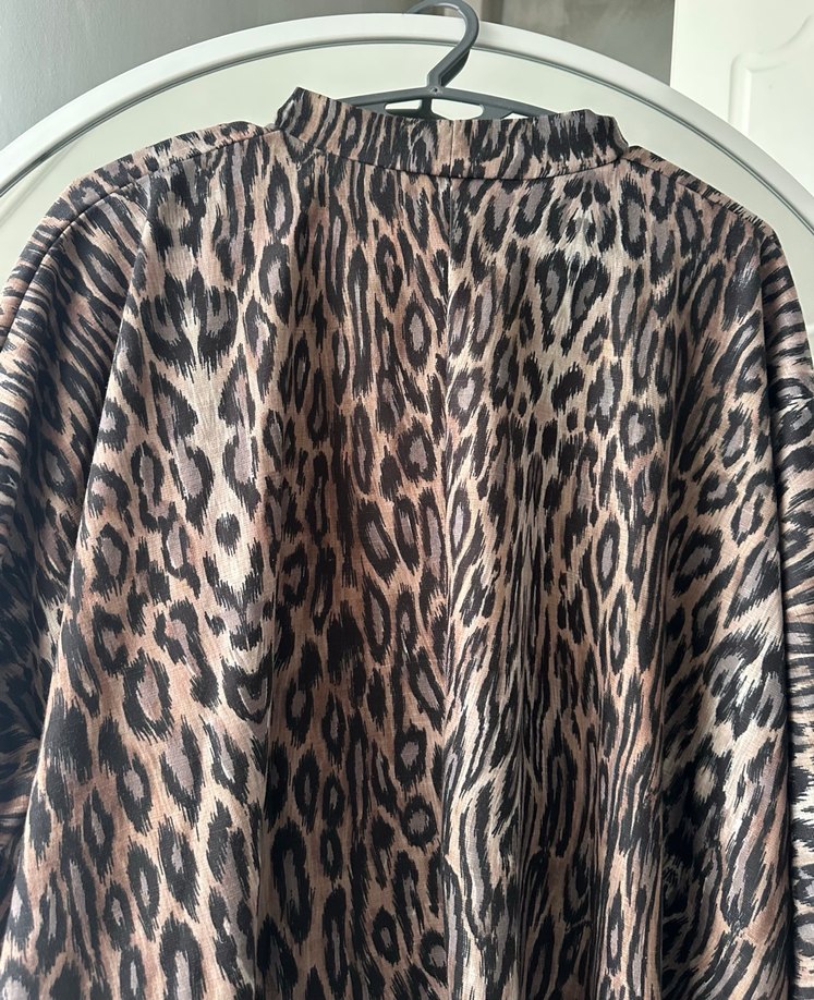 Kahverengi leopar desenli, kadın bluz. Balikci yaka , uzun kollu ve bol kesim, uzun boylu sokak stiline uygun bohem ve retro tarzı yansıtıyor.