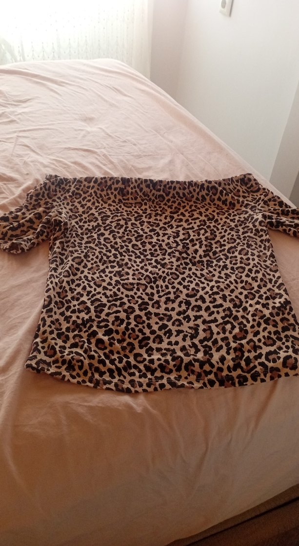 Kadın bluz, kısa kollu, kayık yaka ve bol kesim. Yumuşak sentetik kumaştan, koyu kahverengi leopar desenli ve k detaylı, bohem ve rahat sokak stiliyle uyumlu.
