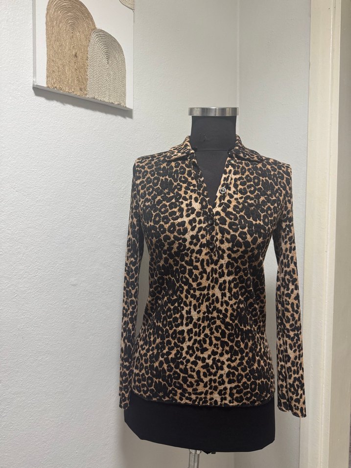 Kahverengi leopar desenli, yakalı ve uzun kollu, vücuda oturan kadın bluz. Sentetik kumaştan, günlük kullanıma uygun,