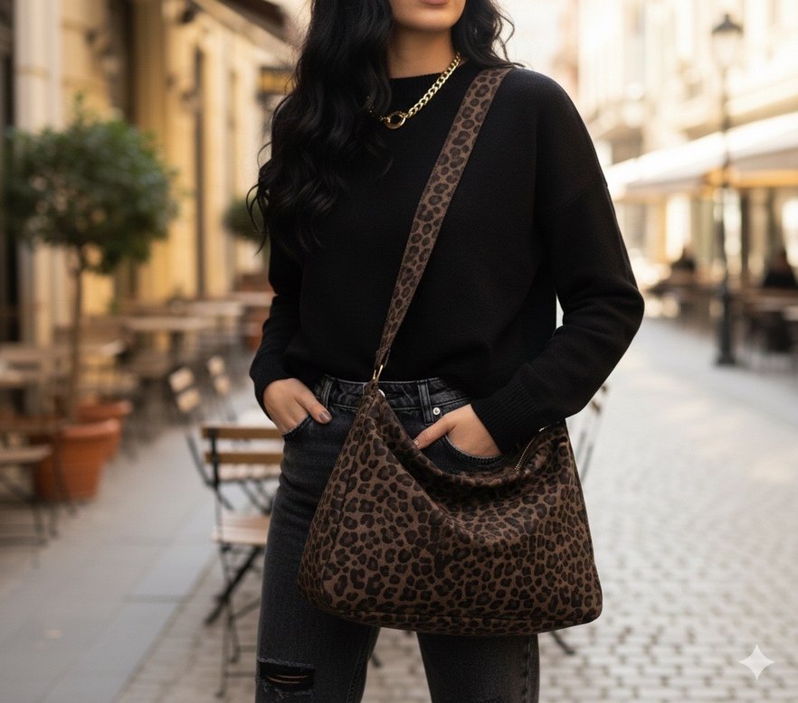 Kahverengi kadın çanta, koyu leopar desenli ve kemerli tasarıma sahip, sokak tarzı için uygun.