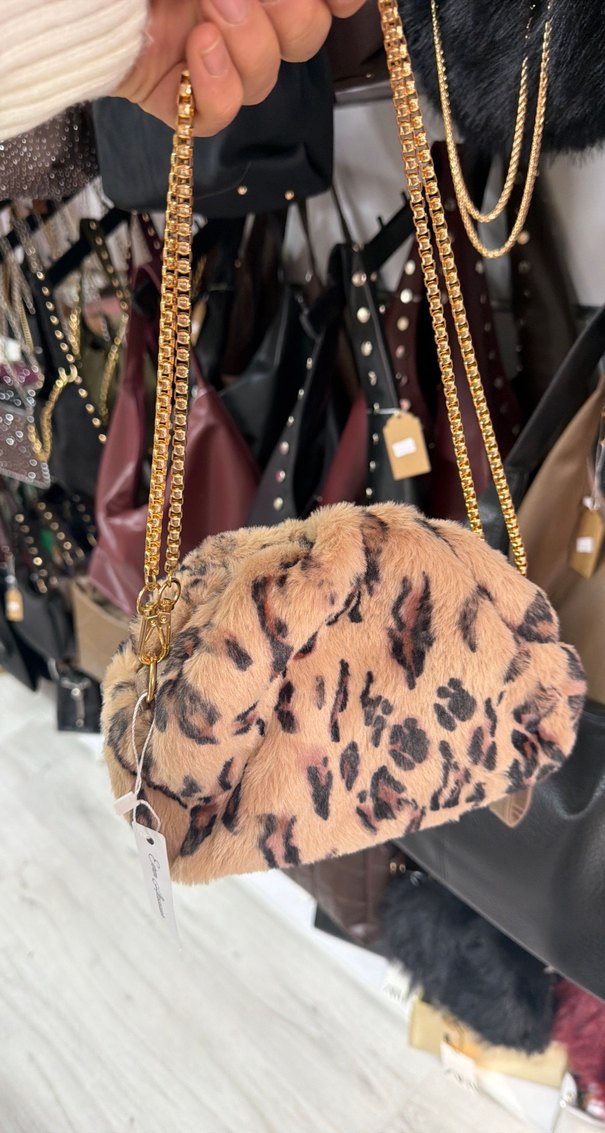 Altın zincir askılı, leopar desenli kahverengi yumuşak kürk detaylı kadın çanta. Trend sokak stiline uygun.