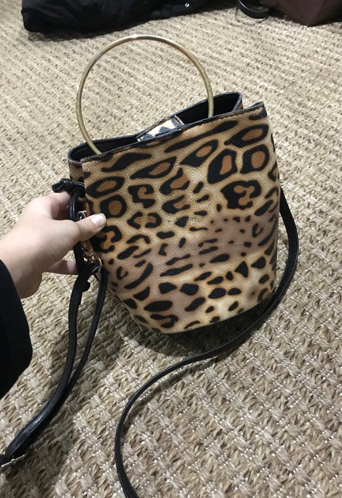 Koyu kahverengi leopar desenli, kürk detaylı kadın çantasıdır. Yuvarlak metal sap ve uzun askıya sahiptir. Sokak modası ve bohem-retro tarzı yansıtır. Günlük kullanıma uygundur.