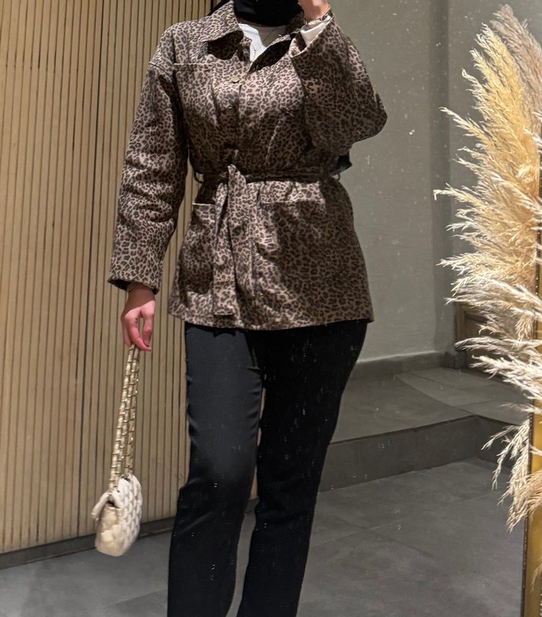 Kahverengi leopar desenli kadın ceket kuşaklı ve notched lapel yakaya sahiptir. Sentetik kumaştan üretilmiş, uzun kollu ve midi boydadır. 36-38 beden. Yasemin Kalaycıdan aldım hiç bir kusur yok