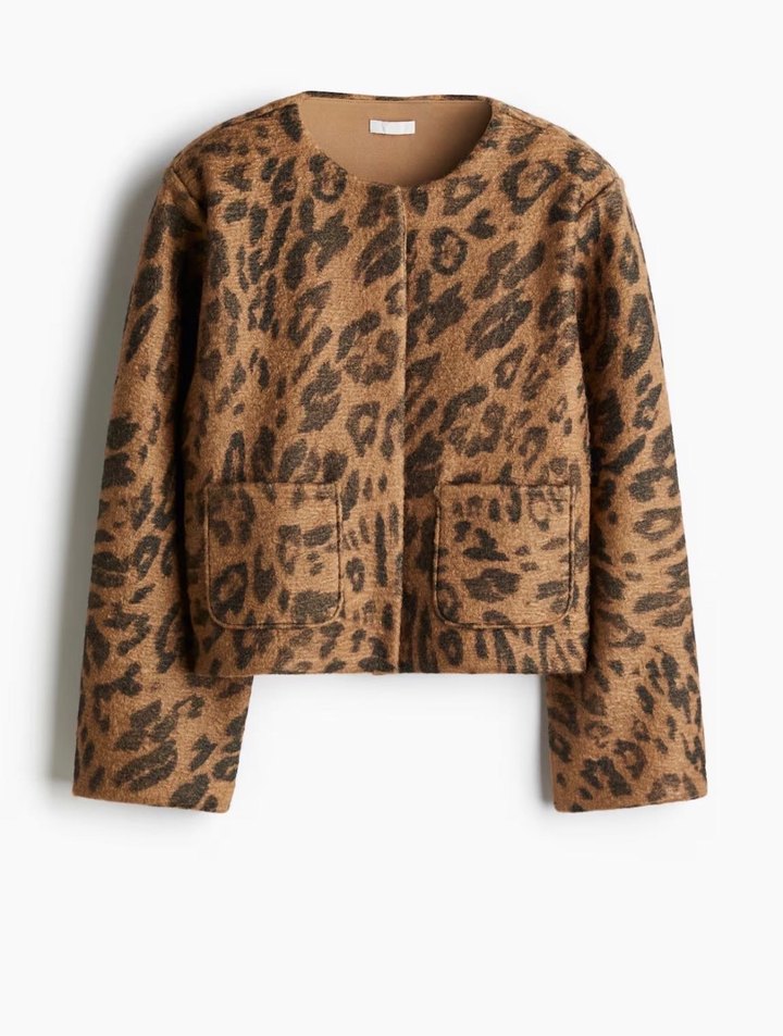 Kahverengi, leopar desenli, kürk detaylı kadın ceket. Uzun kollu, yuvarlak yaka ve kısa boyda, rahat kesim sokak stili için uygundur.