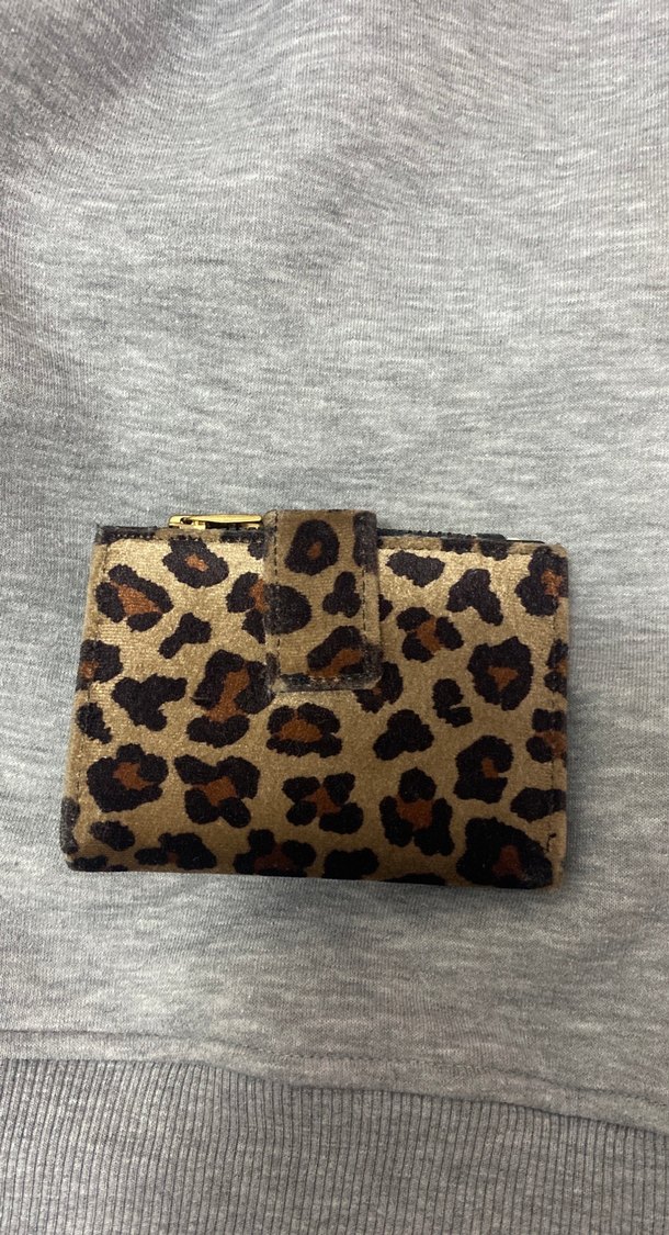 Kahverengi leopar desenli, yumuşak süet kumaştan kadın cüzdan. Kürk detaylı hafif simli