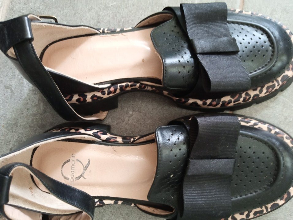 Kahverengi leopar desenli, dolgu topuklu ve tokalı kadın ayakkabısı. Kauçuk malzemeden yapılmıştır, günlük kullanım için uygundur.