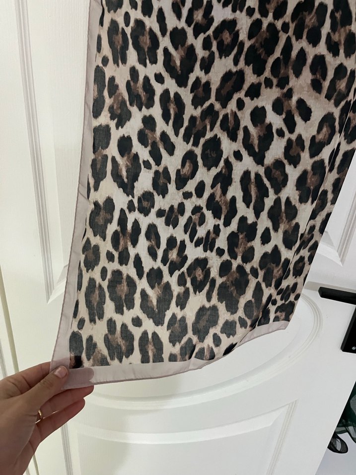 Kahverengi leopar desenli, tüylü detaylı, yumuşak sentetik kumaştan kadın fular. Paris tarzı, bohem ve retro esintili.
