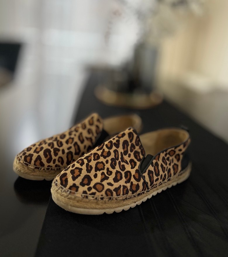 Kahverengi leopar desenli, kürk detaylı kadın espadril. Platform tabanlı kauçuk topuklu, sokak modasına uygun rahat ayakkabı.