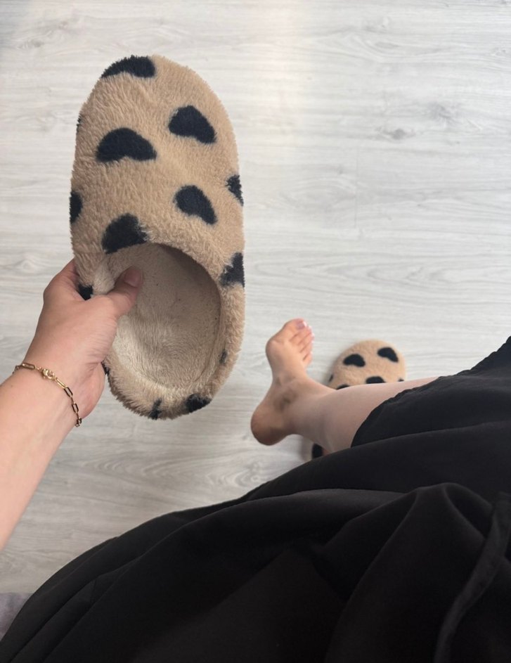 Kahverengi leopar desenli, yumuşak ve sıcak kumaşlı, kürk detaylı kadın ev terliği, çağdaş tasarım.