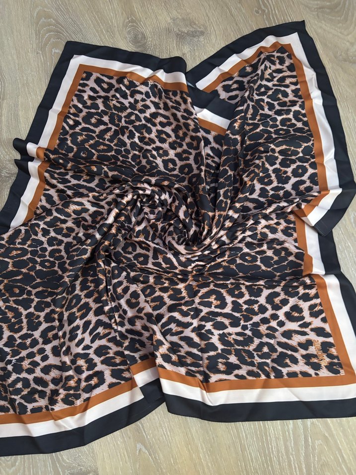 Koyu kahverengi leopar desenli, yumuşak sentetik kumaştan drapeli kadın fular. Rahat, bohem ve retro tarzını yansıtıyor.
