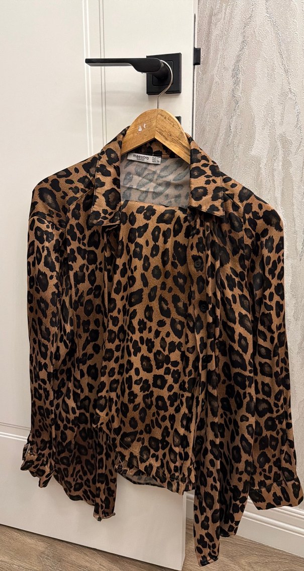 Kahverengi leopar desenli, uzun kollu, yakalı, bol kesim kadın gömlek. Sentetik kumaştan ve kürk detaylı, günlük sokak stili için uygun.