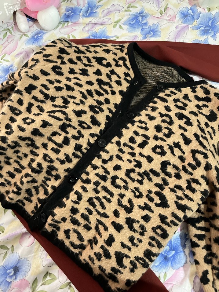 Kahverengi, leopar desenli, uzun kollu, gevşek kesim kadın hırka. Yumuşak sentetik kumaştan, kürk detaylı, düğmeli ve bisiklet yakalıdır.
