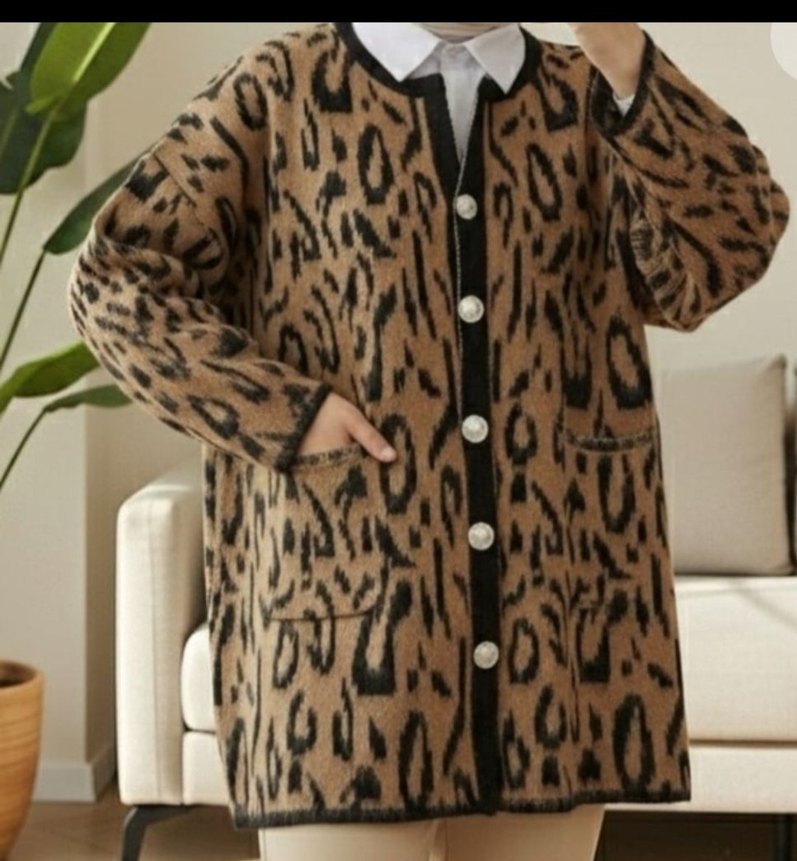 Kahverengi leopar desenli, uzun kollu, normal boyda ve bol kesim kadın hırka.