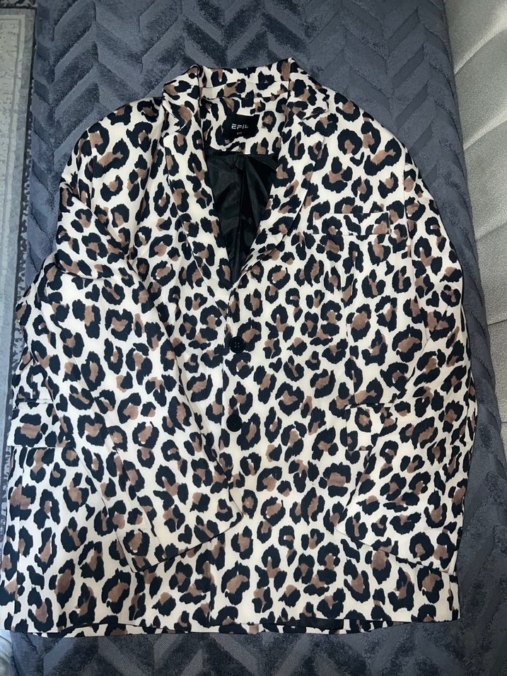 Kahverengi leopar desenli, uzun kollu ve kruvaze yaka kadın kaban. Yumuşak sentetik kumaştan, kürk detaylı, günlük kullanıma uygun rahat ve şık.