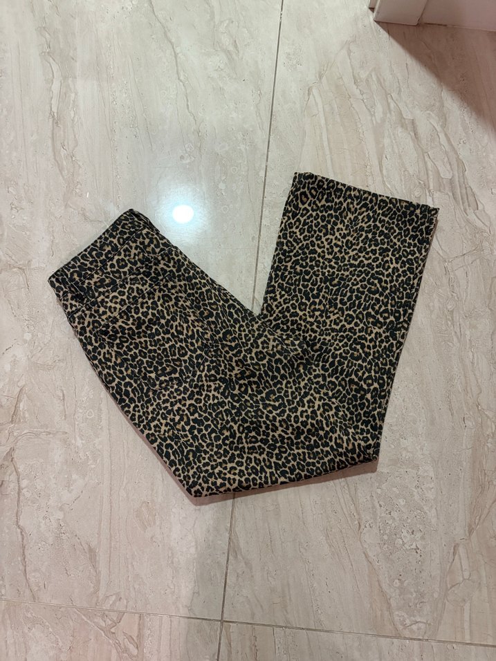 Kahverengi leopar desenli, tokalı, sentetik kumaştan yapılmış, uzun ve rahat kesimli kot pantolon. Sokak tarzı ve dış mekan kullanımı için uygundur.