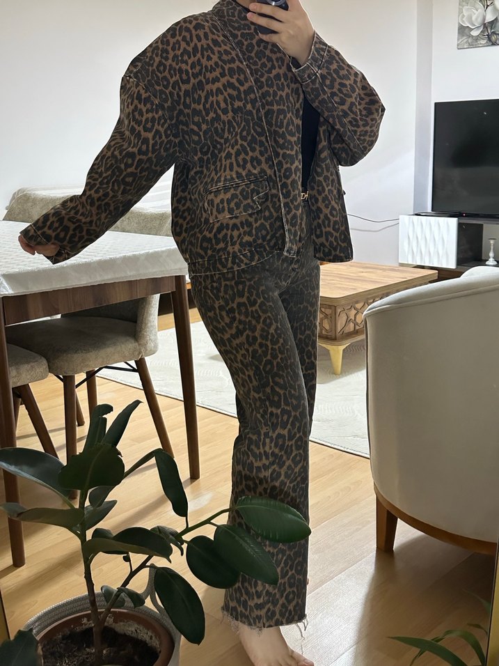 Kahverengi Leopar Desenli Kadın kot takım