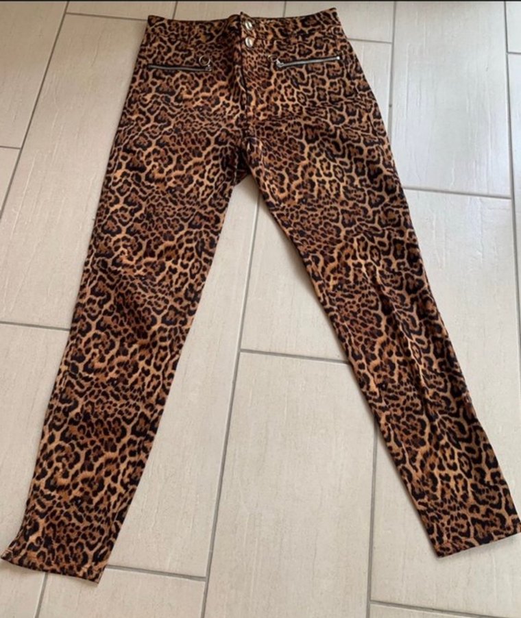 Koyu kahverengi leopar desenli, kürk detaylı, bohem ve retro tarzda, dar kesim midi uzunlukta kadın kumaş pantolon.