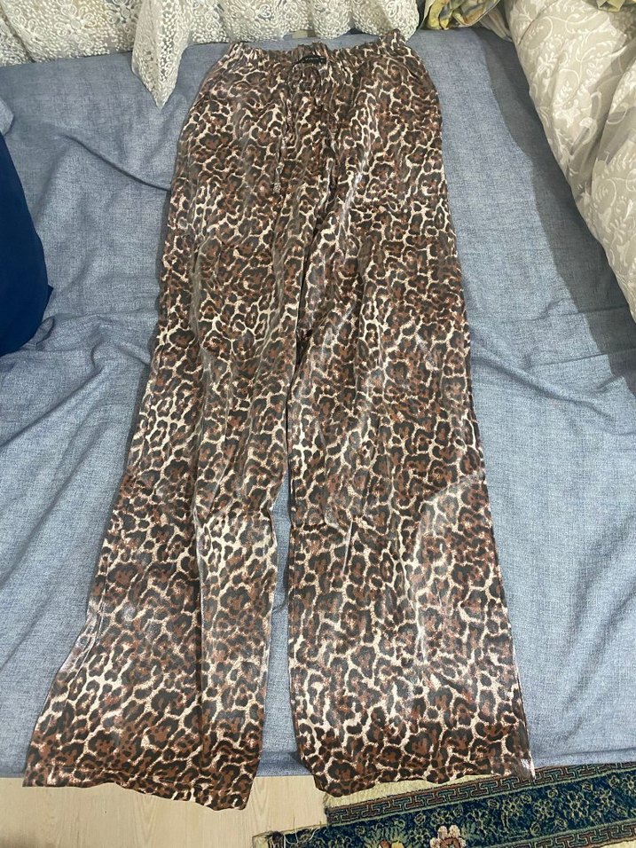 Kahverengi leopar desenli, bol kesim uzun pantolon. Yumuşak sentetik kumaştan, kürk detaylı, günlük kullanım için uygun bohem tarzda.